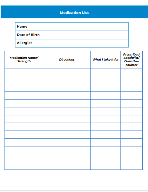 Maintain & Update – Keep your list handy—in your wallet, purse, or phone—and bring it to appointments. Update it any time your medications change.